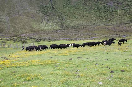 走到一處草坪,南杰和吉美下馬一起去扶雍貝,說是在此處稍作歇息。雍貝的臉色恢復(fù)了紅潤,他取下盤香枝插進吉美濃密的頭發(fā)里,兩人由此發(fā)出了嬉笑聲。馬兒徑自走向草坪深處的水洼里飲水,打著酣暢的響鼻,頸項上銅鈴鐺隨馬兒鬃毛的抖動發(fā)出了“鐺鐺”的聲音。馬兒飲飽了水,轉(zhuǎn)身朝我們走來。繼續(xù)騎行,不知過了多久,日光在頭頂上游移,漸漸偏西。雍貝在前方問南杰,阿尺,巴烏牧場還有多遠?南杰指向眼前的山峰說,登上這座峰頂就到了?;赝宦方?jīng)過的河谷,早已不知去向,我們身處的位置幾乎與周遭巍峨的山巒平齊了。我從衣兜里取出手機測試海拔高度,4820米。