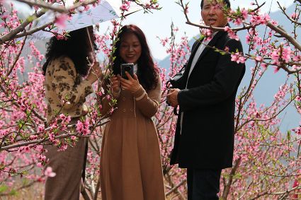 這個(gè)時(shí)節(jié),著名的賞花之地當(dāng)屬瀘定縣冷磧鎮(zhèn)杵坭的桃花谷。從瀘定縣城出發(fā),沿著大渡河右岸一路往下,行約20分鐘就能看到美麗的田野景色。只見,山頭上,田野間,或是房前屋后,統(tǒng)統(tǒng)換上了美麗誘人的春裝。放眼望去,李花、桃花、油菜花競(jìng)相綻放,爭(zhēng)奇斗艷。這里,桃花尤其繁盛,沿著山谷錯(cuò)落有致、次第盛開,讓人目不暇接,用一步一景來形容也一點(diǎn)不為過。