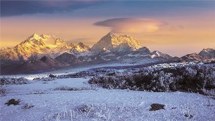 在一片片雪花的飄落中,冬天來了,它帶著風(fēng)、帶著雪,帶著讓人不禁要裹緊衣服的寒冷來了,萬物在冬的腳步中慢慢俯下身子貼緊了大地。蕭索、蒼涼、千里冰封、萬里雪飄……在這些形容冬天的詞語里,我們看到的是只有黑白兩色的畫面,黑的是物,白的是雪。但是,在甘孜州,冬天卻是色彩繽紛的,不僅有白的雪,還有藍的天、綠的水、黃的樹、紅的葉……還有炊煙升起的藏寨、水汽氤氳的溫泉和日照金山的美麗景致。