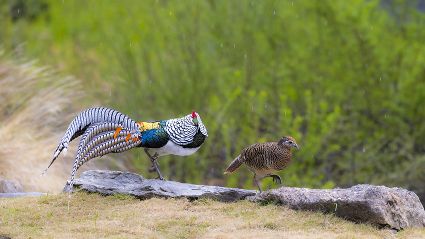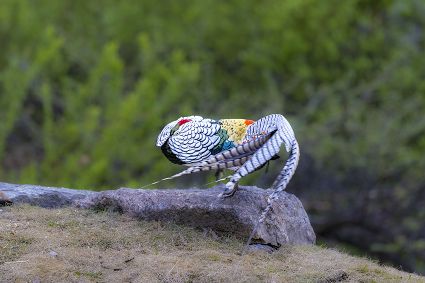 4月16日,筆者在康定市雅拉鄉(xiāng)境內(nèi),再次拍攝到國家二級保護(hù)動物白腹錦雞求偶的清晰視頻。一只色彩斑斕的雄鳥,拖著黑白相間的云狀斑紋尾羽,圍著雌鳥跳起了“圓舞曲”。整個求偶過程有十多分鐘。每年三至五月是白腹錦雞求偶期。