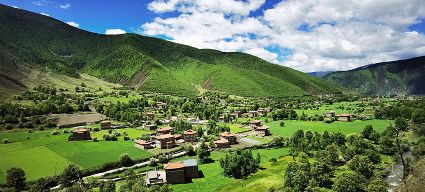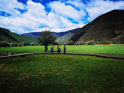夏日,暖陽(yáng)溫柔,沿途入眼皆是綠意。聽說(shuō),俄色花盛放的時(shí)候,潔白的花成簇成團(tuán),一樹樹漫山遍野,像九天的云朵堆滿山谷田野,汽車從公路疾馳,風(fēng)里都是俄色的清香。我們來(lái)的時(shí)候稍微遲了,錯(cuò)過(guò)了俄色的花期,花開荼蘼,殘花在蒼翠的枝葉里躲藏,風(fēng)里是飛舞的花瓣,紛紛揚(yáng)揚(yáng),在棕紅的棧道鋪成白色的云錦,樹下是芬芳的余味。棧道邊,金黃的雪白的野花鋪灑在翠綠的草甸上,像濃烈的水彩。地里的青稞,綠得晃人眼睛,綿延的是木雅人勤勞與希望。遠(yuǎn)處,木雅民居在各種深綠淺綠的陪襯下更加的濃墨重彩。