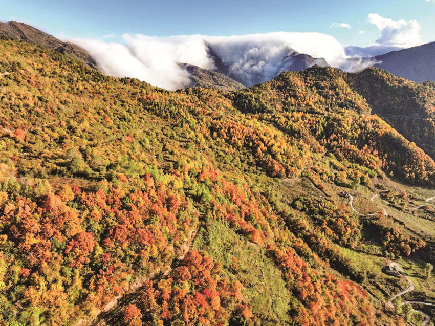 冷風(fēng)肅起,大雁南飛,銀杏樹開始了一年中最華麗的篇章,風(fēng)兒吹過,銀杏樹葉紛紛揚(yáng)揚(yáng)地,從樹上飄落下來,宛如無數(shù)只金色的蝴蝶,在空中漫天飛舞?!八厣鷿狻?,滿山層林盡染,演繹著另一番亮麗。多種色彩交織在一起,如同一幅流動的美麗畫卷,使得這個季節(jié)更有韻味。