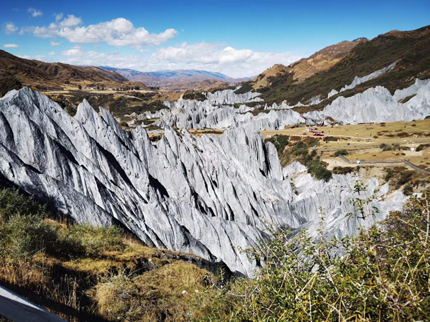 墨石公園的石林,分布在雅礱江支流慶大河的東側(cè)坡地上,川藏公路從旁經(jīng)過。離開公路,沿一條小路行幾百米,就是觀景臺(tái)。