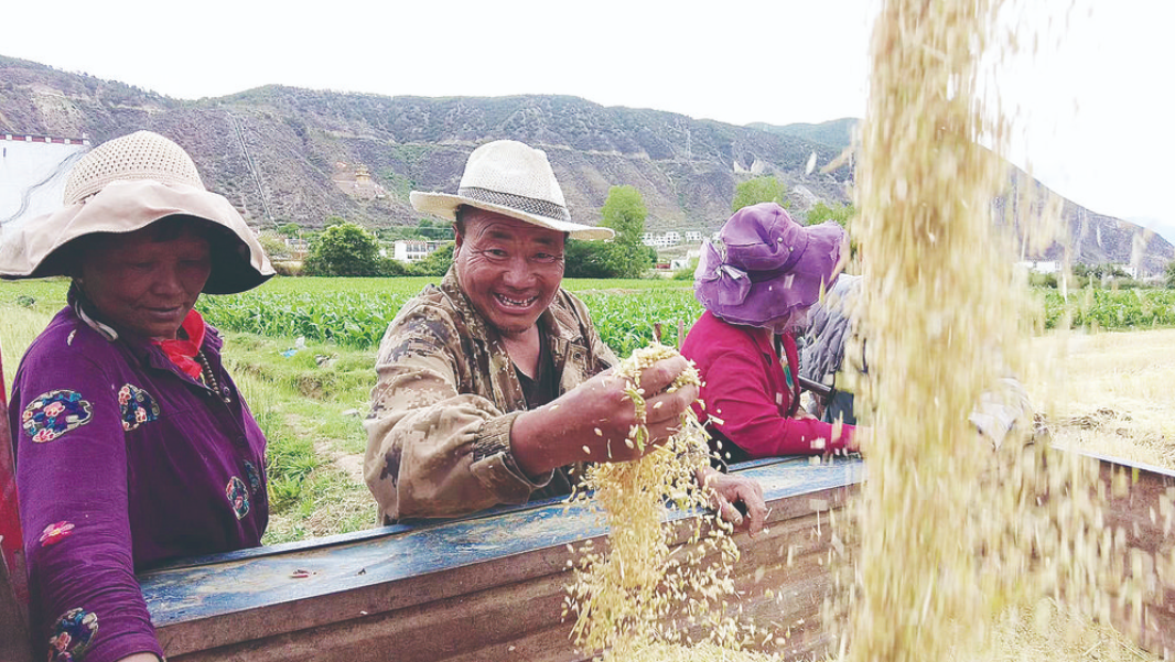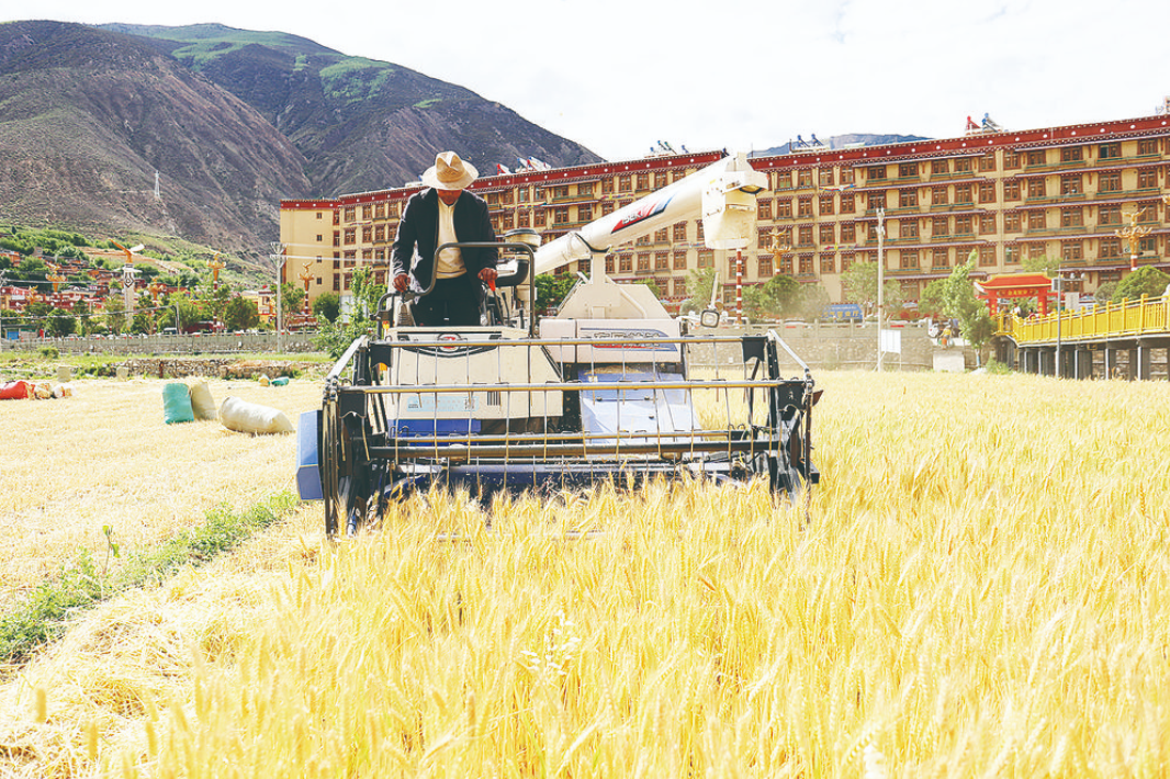 我州各地青稞、小麥陸續(xù)進(jìn)入成熟期,眼下正值“雙搶”關(guān)鍵期。放眼望去,在廣袤的田野上,一片熱火朝天的繁忙景象。村民們頭頂烈日,腳踏泥土,緊張而有序地投入到“雙搶”工作中。新型農(nóng)具為“雙搶”注入強大動力,收割機在田間往來穿梭,一顆顆飽滿的麥粒從倉門傾瀉而下,源源不斷地被送上拖拉機,將成熟的小麥、青稞迅速收割歸倉,展現(xiàn)出一幅喜慶熱鬧的豐收畫卷。