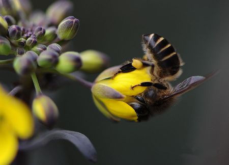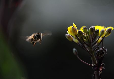 千百年來,許多小宗蔬菜的傳宗接代依靠中華蜜蜂授粉。紫油菜花在初春開放,這個(gè)季節(jié)西方蜜蜂因畏寒仍在巢中被人工飼養(yǎng),只有中華蜜蜂不怕寒冷,不嫌花源稀少,只要?dú)鉁剡_(dá)到8℃,它們就出勤了。 熊小立圖文 攝于成都