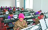 孩子們?cè)诓賵?chǎng)上練習(xí)民族舞蹈。