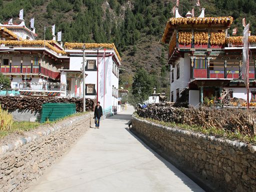 走進(jìn)冬日的丹巴縣革什扎鄉(xiāng)三道橋村,一幅如詩如畫的鄉(xiāng)村美景映入眼簾:一排排新穎別致而獨(dú)具嘉絨特色的白色藏房鑲嵌在彎彎的革什扎河旁,格外耀眼。一條條平直寬敞的硬化路像一根根潔白的哈達(dá)連接家家戶戶,寬敞平坦的公路上,轎車、農(nóng)用車、拖拉機(jī)穿梭來往,別具一格的村民活動(dòng)中心紅旗迎風(fēng)飄揚(yáng)。 這是如今的三道橋民族團(tuán)結(jié)新村。