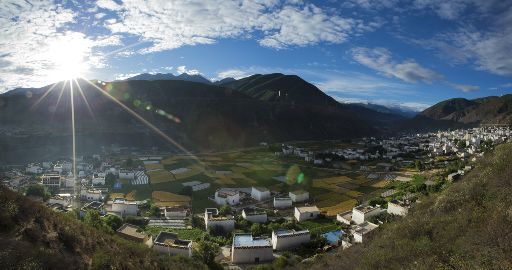 清晨,瓦藍(lán)瓦藍(lán)的天空云霧繚繞,周圍的景物一片朦朧,就好像童話里的仙境,一會(huì)兒,太陽(yáng)從東邊冉冉升起,霧也漸漸消失,村子里屋頂上飄著裊裊煨桑的煙子,我站在山岡上從高處向下俯望,只見高山峽谷之中,層層翠綠的梯田簇?fù)碇l(xiāng)城特有的白藏房,山下的田野,就像一片金色的海洋,將秀麗的田園裝扮得更加如詩(shī)如畫。一陣晨風(fēng)吹過(guò),麥田上蕩起了一道道金色的波紋,遠(yuǎn)處傳來(lái)了畫眉鳥的歌聲,我被眼前的一切迷住了,仿佛一切都靜止了,她讓我的夢(mèng)從這里開始。