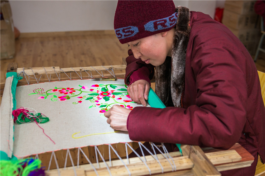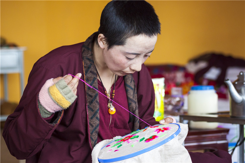 行攝途中經(jīng)過塔公鎮(zhèn)扎西寺,遇見康定市婦聯(lián)邀請到的中國國家級非物質(zhì)文化遺產(chǎn)藏羌織繡傳承人,正在為自愿報名的數(shù)十名覺姆傳授藏繡圖案基礎(chǔ)知識、藏繡圖案的常見表現(xiàn)形態(tài)、挑繡、納花繡、鏈子扣、扎花、提花、拼花、勾花和手繡等各種繡法技能。佛教的學(xué)習(xí)本是無止境的,我被這安靜、專注的場景深深感染,按下相機快門的一瞬就記錄了朵朵盛開在指尖的蓮花。