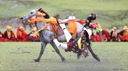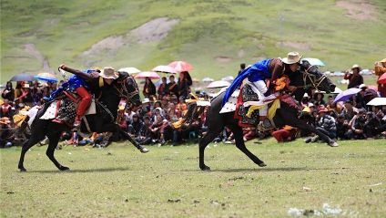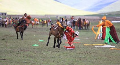 7月23日,四川甘孜藏族自治州理塘縣村戈鄉(xiāng)賽馬活動(dòng)開始,牧民們?cè)隈R背上一顯身手。每年藏歷六月,當(dāng)草原上格?;ㄊ㈤_的時(shí)候,四川省理塘縣24個(gè)鄉(xiāng)(鎮(zhèn))就會(huì)按照習(xí)俗舉辦隆重的賽馬會(huì)來拜祭神山,慶祝豐收。迄今有400多年歷史的賽馬分為耐力賽、小走賽、馬術(shù)賽等,其中最為精彩的是馬術(shù)賽:馬肚藏身、馬背倒立、飛騎射擊、拾哈達(dá)等,驚險(xiǎn)刺激。2008年6月,此項(xiàng)活動(dòng)被列入四川省級(jí)非物質(zhì)文化遺產(chǎn)保護(hù)項(xiàng)目。(朱虹 葉強(qiáng)平)