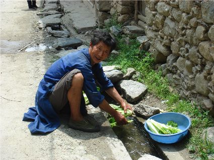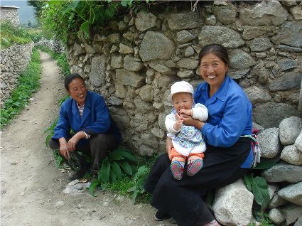 那天清晨,我們一行就乘坐曉雨哥所開(kāi)轎車從康定城出發(fā)了。從顯得很懸的山路上到位于山頂平壩的嵐安古鎮(zhèn)時(shí),才8點(diǎn)過(guò)一點(diǎn)。朝鎮(zhèn)里走去,先后見(jiàn)到了從地里背洋芋回家的小孩、從地里收了豆菽枯藤的中年人等。