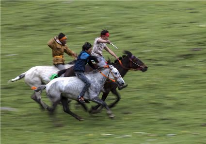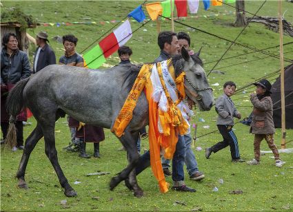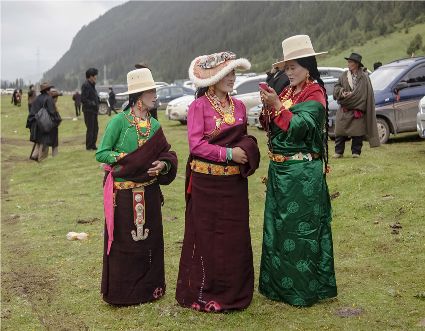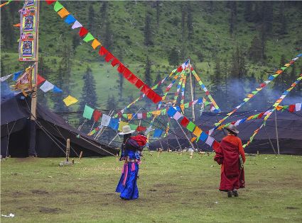 夏天是草原最美的季節(jié),道孚縣玉科草原在這個季節(jié)里正舉辦久負盛名的賽馬活動。五顏六色的彩帶飄舞在牛毛大帳篷周圍,喜慶氣氛四處洋溢。來自遠近牧區(qū)的親屬也專程趕來玉科草原訪親會友,參與賽馬角逐,濃郁的民族盛會令人耳目一新。