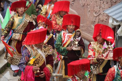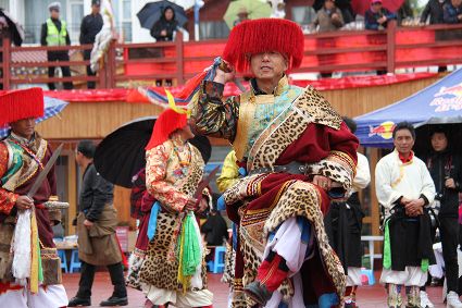 除了歌舞文化,德欽還是民俗文化最大的平臺,神山祭祀是村村寨寨必不可少的活動,在德欽,藏民對山水自然賦予了靈性,認(rèn)為自然也是和人一樣有著生命和靈性,尊重自然演繹出神山祭祀活動豐富多彩。“刀贊” 藏語稱“百諧”。在德欽農(nóng)村,刀贊是祭祀活動的重頭戲,這一天,不亞于一個盛大的服飾表演。相傳“百諧”是古時村民為消除戰(zhàn)亂,祈福平安的一項傳統(tǒng)祭祀活動,延續(xù)至今已經(jīng)成為一項傳統(tǒng)的民俗活動?!鞍僦C”既是祭祀活動的一個儀式,也是一個獨立的傳統(tǒng)民俗活動,村里每戶一男丁在這一天必須參加“百諧”。“蘇夏”是村里男人戴的最為隆重的帽子,他不同于金邊帽和狐皮帽。長刀是“刀贊”的道具, “吉祥的日子里,我們一敬天地,賜給我們帶來幸福的生活;再敬尊敬的共產(chǎn)黨,為我們帶來平安吉祥;三敬慈祥的雙親,教會我們?nèi)绾巫鲆粋€好人……”朗朗上口的說詞伴著閃閃的刀光起舞,頗具康巴壯士的英武陽剛。