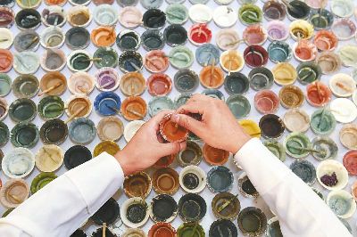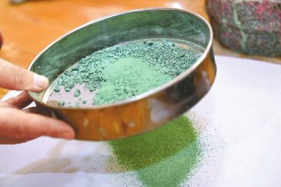傳統(tǒng)的唐卡是藏族文化中一種獨(dú)具特色的繪畫藝術(shù)形式,需經(jīng)繃布、打磨、定位、起稿、涂色、暈染、拉線條、拉金線等多種程序,天然原料作色保證了畫作幾百年后色澤還依然鮮艷。在著著的畫室里,擺放了百個(gè)裝滿各色礦物質(zhì)顏料的調(diào)色小碗,“上色用的是延續(xù)千年的礦物研磨顏料?!睘榱俗岊伭献魃鶆?,著著還用自己的辦法搞出了專用的顏料攪拌機(jī)。