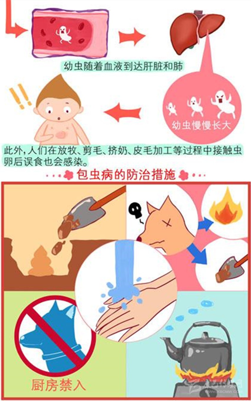 我們先看包蟲病的發(fā)生過程:狗、狼、狐貍等食肉動物食入感染棘球幼蟲(棘球蚴囊里可會有數(shù)百萬個棘球幼蟲)的羊、牛、豬、馬、鹿、兔、鼠的生內(nèi)臟或未熟的肉類后,棘球幼蟲在它們小腸腸壁隱窩內(nèi),經(jīng)7-8周生長,發(fā)育成為米粒大小的成蟲——棘球絳蟲。成蟲有頭、頸、體節(jié),體節(jié)中有成節(jié)和孕節(jié),成蟲無雌雄之分,屬于雌雄同體,每隔7-14天蟲卵形成,孕節(jié)脫落隨糞便中排出,成節(jié)再發(fā)育為孕節(jié);同時,成蟲還可自然下滑其肛門引起肛門發(fā)癢,這時狗、狼、狐貍等回頭用舌舔、牙咬,孕節(jié)被壓碎,蟲卵排出。脫落的孕節(jié)可沿草地或植物蠕動爬行,孕節(jié)邊走邊下蛋,導(dǎo)致蟲卵四處擴撒。蟲卵細小,肉眼看不見,它在干燥環(huán)境中能存活11-12天,在2℃水中能活2.5年,在冰中可活4個月。就是這樣蟲卵它引起狗自身和與其接觸的羊、牛、豬、馬等家畜的皮毛污染外,它還隨著狗、狼、狐貍等活動場所不同污染牧場、畜舍、蔬菜、土壤及水源等環(huán)境;毫無警惕,多而細小的蟲卵它們易被人和羊、牛、豬、馬、鹿、兔、鼠等草食動物誤食吞下,吞食的蟲卵它們很快在機體的腸內(nèi)孵出變?yōu)橛紫x,幼蟲鉆入腸壁,隨血循環(huán)到達我們和羊、牛、豬、馬、鹿、兔、鼠等草食動物的肝、肺、腦、心、腎等器官居住下來,緩慢生長,引起對應(yīng)部位的包囊蟲(又稱棘球蚴),出現(xiàn)包蟲病。包蟲病嚴重程度取決于包囊蟲的體積、數(shù)量、寄生時間、部位和繼發(fā)反應(yīng),而危害人畜健康和生命安全。
