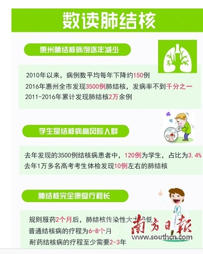 惠州市第一人民醫(yī)院健康管理中心主任彭可同樣為這一論斷提供了數據支撐。該院長期以來負責惠州市直高中的高考體檢工作,據彭可透露,肺結核是高三學生在體檢中檢出異常最多的病癥,2016年共有1萬多名考生由該院組織體檢,其中發(fā)現10例左右的肺結核。