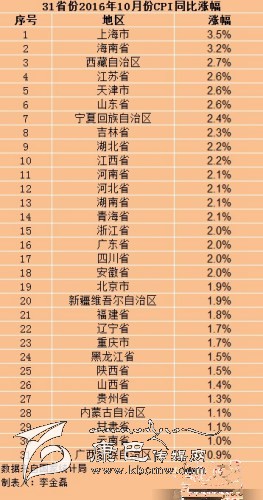 在31個省份中,上海10月份CPI漲幅全國最高,為3.5%,漲幅比9月回落0.1個百分點。其次是海南,漲幅為3.2%。上海、海南也是目前全國兩個CPI漲幅處于“3時代”的地區(qū)。