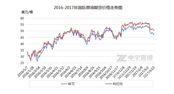 2017年3月以來,國際油價持續(xù)走低。3月7日,美國WTI原油期貨在53美元形成下行拐點,隨后連跌四日,在48、49美元附近持穩(wěn)數(shù)日后繼續(xù)小幅下跌。截至3月24日收盤,美國WTI原油期貨報47.97美元/桶。