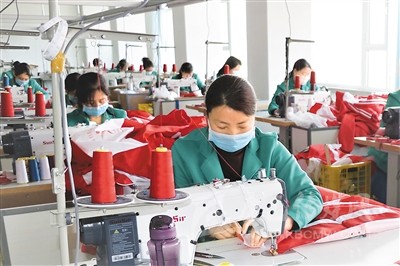 近期,甘肅省平涼市靜寧縣在做好疫情防控工作的同時,積極推動縣內扶貧車間復工復產。截至目前,全縣57家扶貧車間已有39家恢復生產,吸納帶動了536名貧困群眾在家門口就業(yè),增收致富。圖為靜寧縣城關鎮(zhèn)的村民在當?shù)匾患曳鲐氒囬g縫制衣服。王 毅攝(人民視覺)