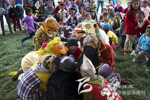 亞索節(jié)也相當(dāng)于耍壩子,青藏高原、云貴高原一帶特有的戶外休閑活動(dòng)。找一塊開闊的地方,耍起來。龍旺塘就是河谷里的一個(gè)壩子,巴塘縣上很多群眾娛樂活動(dòng)都選擇在這里,巨大的帳篷已經(jīng)搭起來,中間一個(gè)大草坪就是藏戲表演的舞臺(tái),四周的鄉(xiāng)民都來了,圍成一個(gè)大圈。