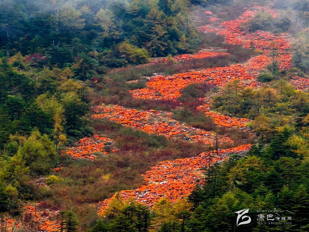 路段兩邊就是貢嘎雪峰所在的大雪山,貢嘎雪峰是整個(gè)橫斷山區(qū),也是青藏高原東部最高的山峰,海拔高達(dá)7556米。圍繞著貢嘎雪峰有許多海拔五六千米的雪峰,這條路就要從這些雪峰中的一處低矮處通過(guò)。我看到一條條冰川從雪峰下流淌下來(lái),冰川流動(dòng)的速度太快,還來(lái)不及融化,就沖進(jìn)了郁郁蔥蔥的森林,冰川末端融水形成的河流蜿蜒地流淌在針葉林中。河谷很寬闊,這是洪水和泥石流暴發(fā)時(shí)沖出來(lái)的。然而奇怪的是本來(lái)應(yīng)該是灰白色的卵石鋪就的河谷,現(xiàn)在卻是鮮紅的顏色。紅色的河谷從雪山一直鋪陳下來(lái),好像是一個(gè)油漆匠把他的油漆桶弄翻了,紅色的油漆流淌出來(lái),又好像行為藝術(shù)家的大制作。