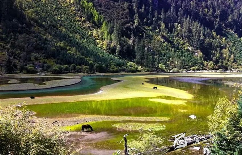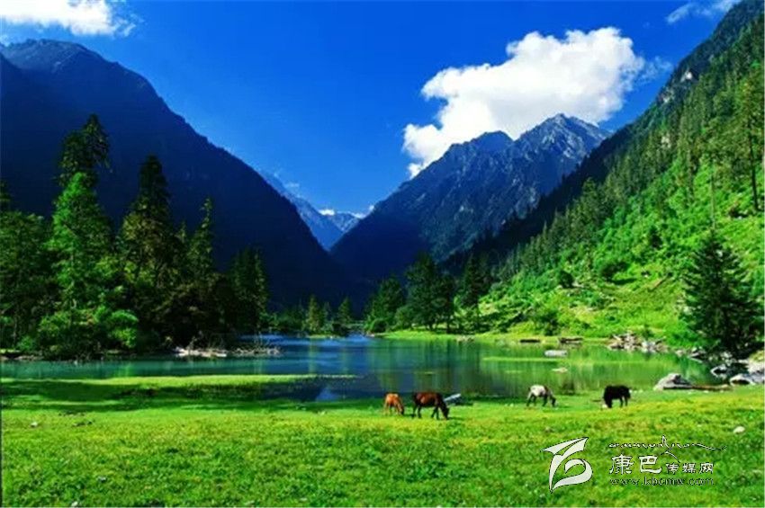 藍(lán)寶石般的高原湖泊、銀鏈般的溪流迂回盤(pán)旋,時(shí)常有馬兒在湖邊漫步。
