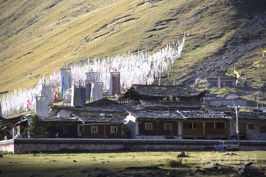 當(dāng)太陽(yáng)落進(jìn)金龍雪山的懷抱,最后一抹余暉斜照在靜靜的莫斯卡村莊上。東邊的小河在斜陽(yáng)里歡快的流過村莊,莫斯卡的女人在夕陽(yáng)里,正領(lǐng)著孩子回家。西邊牧歸的男人悠閑的向山下趕著牦牛。村莊背后漫山的經(jīng)幡,在晚風(fēng)里誦經(jīng)祈福……格薩爾王的傳說就在這樣的時(shí)光里,雕琢成了漫山的石刻,在經(jīng)年的歲月里傳頌。