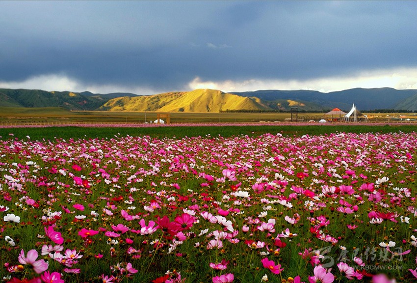 干凈、壯闊、深邃,藍(lán)天白云下,金露梅、波斯菊、峨眉薔薇……數(shù)十種花朵競相盛放、爭奇斗艷,一陣細(xì)風(fēng)過后,群花緩緩搖擺,散發(fā)著縷縷清香。