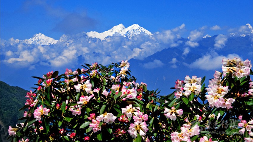 杜鵑花簇擁貢嘎山。 黃永邦 攝