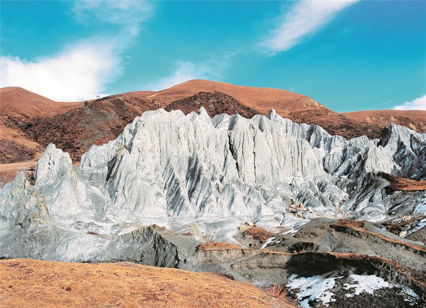 質(zhì)地較軟的糜棱巖石林,它的生命也是有限的,在長(zhǎng)時(shí)間的風(fēng)霜雪雨中,終有一天它也將分崩離析、成泥作土。在大自然面前,它既壯觀又脆弱!它就像矗立于川藏線上的驚嘆號(hào),不僅蘊(yùn)藏著鮮水河斷裂帶的諸多信息,又以孤傲的身軀、奇異之美詮釋著大自然的神秘力量。