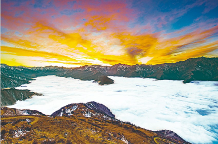 一條群山環(huán)繞的河谷,從衛(wèi)星圖上看,它就像一片樹葉,水系是莖脈,森林是葉的紋理,群山是齒狀起伏的葉緣。灣壩地區(qū)三面皆被海拔在4500米以上的高大山體環(huán)峙,僅南側(cè)有窄如細縫的峽谷通往外域,自然地理環(huán)境相對封閉原始,山谷風(fēng)作用就此產(chǎn)生。即當太陽出來后,山坡比谷底更早被加熱,山坡空氣受熱膨脹,密度變小,利于中午前后谷底的氣流補償進來,形成向上抬升,增加了上升動力;加上云層的高度小于山頂?shù)母叨?,就形成了宏偉壯闊的云海景觀。灣壩云海是整個甘孜州規(guī)模最大的云海之一,也是最容易見到的云海,其云海規(guī)模達上萬畝,基本全年都可見,一年中最佳觀賞時間是春夏之際。