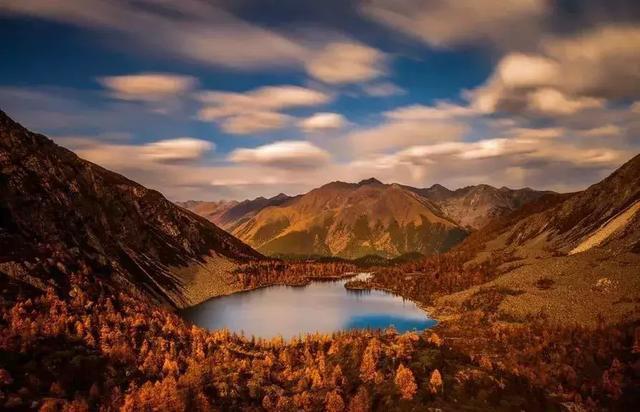 漫山遍野的紅樺林承包了黨嶺的秋日色彩,4000多米的葫蘆海被山谷自然包圍,圓形的平靜湖面如明鏡,倒映著天空與山林,美得一塵不染。