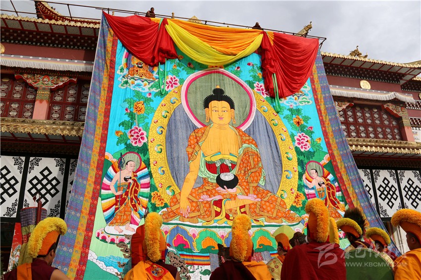 一大早,寺廟僧人身穿節(jié)日的盛裝,在莊嚴(yán)的鼓樂聲和誦經(jīng)聲中,僧眾們與廣大群眾仰望佛像,隨著黃綾的徐徐拉開,氣勢恢宏的巨幅佛像展現(xiàn)在眾人面前,預(yù)示人們平安吉祥,風(fēng)調(diào)雨順,安康幸福。