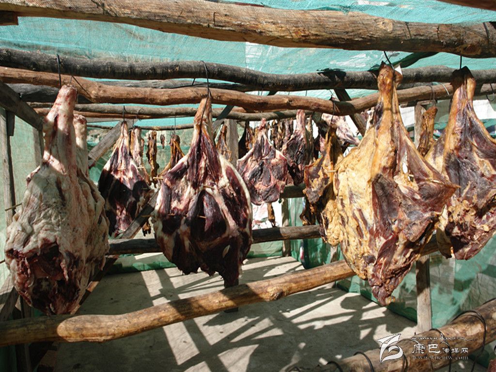 丹巴嘉絨藏族年期間,在酸菜包子、火燒饃、香豬腿等眾多的風(fēng)味飲食中,“藏香豬腿”是必不可缺的美食佳肴,也是給長(zhǎng)輩拜年和親朋好友間互送的最佳禮品。“藏香豬腿”的制作方式也象丹巴嘉絨藏族年一樣的獨(dú)特。丹巴人宰殺年豬的方式通常有用繩索死吊或者用刀從勁入殺心臟致死兩種,現(xiàn)在采用后一種方式宰殺豬居多。當(dāng)?shù)厝藢⒇i宰殺后用熱水燙,處理好豬毛,再在胸口用刀開(kāi)一孔,將手伸人胸腔扯斷心肺連接處,然后將其剖開(kāi),并把肥、瘦豬肉分離開(kāi),剝?nèi)グ逵?,處理好其他?nèi)臟,將豬腿按原形分離,爾后經(jīng)霜凍、柏枝熏、自然風(fēng)干后存放在儲(chǔ)藏室內(nèi)。豬腿存放一冬后,色、香、味俱佳。食用時(shí)煮成半熟或用炭火將表皮烘烤,切成小塊狀或撕成粉絲狀,在百米內(nèi)即可聞到香味,入口鮮嫩清香,營(yíng)養(yǎng)豐富,誘人食欲。