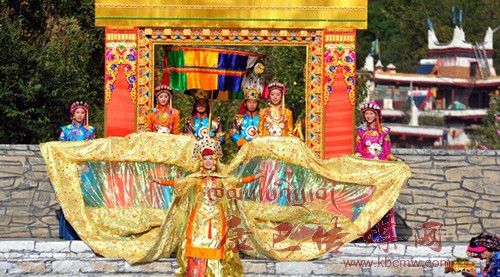 在催人奮進的戰(zhàn)鼓聲中,一群身披甲胄的士兵拿著長劍,背著巨弓走到臺前,在鏗鏘的戰(zhàn)鼓聲中,戰(zhàn)士們做著各種競技動作,模仿武士們互相攻擊的樣子,那矯健的身影展示了遠古時代嘉絨藏族先民們?yōu)榱松媾c自然努力抗爭的場景。過了一會兒音樂一轉,戰(zhàn)鼓聲漸漸減弱,在鳥雀的陣陣啾啾聲中,一座木門慢慢的開啟,一位身披長袍、頭戴鳳冠的女王在眾多美女的簇擁下,緩緩走下臺階步入舞臺中央,此時,一位手捧托盤的老者來到女王面前單膝下跪,將托盤高舉過頂,并邀請女王品嘗佳肴,女王將中指在酒中蘸了蘸,并曲起中指向四周輕輕彈去,寓意愿將杯中美酒與四方百姓同飲。在女王面前還放置著一個凈水桶,桶中盛滿了清澈的甘泉,桶上橫放著一枝柏樹枝,女王伸出纖纖玉手,拿著柏樹枝在水中蘸了蘸,面向墨爾多神山撒去,寓意向神山祈福。這是此次《美人谷·丹巴》節(jié)目展演中的序曲部分,有著強烈的東女神韻,將遠古時代東女國女王遺風展演的淋漓盡致。