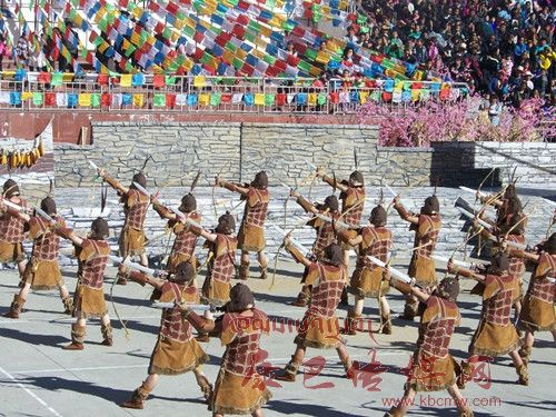10月26日,在甲居藏寨,處處洋溢著豐收和歡樂的氣氛,人們扶老攜幼,身著節(jié)日的盛裝走到一起,來共同慶祝丹巴嘉絨風情節(jié)的順利召開。在一塊空地中,搭建了臨時的舞臺,看臺上,幾座古碉模型傲然挺立,在不遠處,一座古碉矗立在一座小山包上,與古碉模型遙相呼應、相映成趣。上午9時40分,當節(jié)目主持人宣布嘉絨風情節(jié)正式開始時,一束束搖曳的煙花向空中飛去,在空中炸響后,散發(fā)出五顏六色的煙霧,其中有的還幻化成幾多小小的降落傘,就像多多盛開的鮮花在空中綻放。演出現(xiàn)場前的大地和遠處的小山坡上到處都站滿了熱情的觀眾,合著禮花的爆裂時的響聲,將手中的小紅旗展開,高舉過頭頂,有節(jié)奏的左右搖動,霎時間,整個現(xiàn)場成為了紅色的海洋。