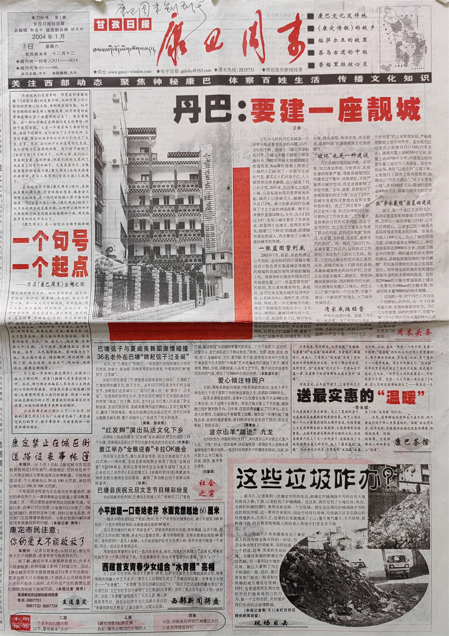 經(jīng)過緊鑼密鼓的籌措后,2004年1月3日,也就是在《甘孜報》正式改為《甘孜日報》的第三天,第一期《康巴周末》與讀者見面了。《康巴周末》創(chuàng)刊號的報頭是時任《甘孜日報》社副總編輯胡慶和先生書寫的,同時還配發(fā)了我撰寫的題為《一個句號、一個起點》的發(fā)刊詞。創(chuàng)刊號第一版推出的是周末新聞版,當(dāng)期與讀者見面的欄目包括:周末頭條、社會之窗、直通康定、現(xiàn)場目擊、康巴茶館、西部新聞拼盤等;第二版為周末綜合版,推出的是案例拾萃、健康文本欄目;第三版為周末綜合版,推出的是文化廣場欄目;第四版為天下版,推出的是國內(nèi)外奇聞逸事。此外,《康巴周末》創(chuàng)刊伊始,還推出了有獎?wù)骷侣劸€索活動,凡是提供有一定新聞價值的社會新聞,經(jīng)采訪核實后,都會給予線索提供者一定獎勵。這種線索征集活動,不但擴(kuò)大了新聞源,還在一程度上為《康巴周末》迅速贏得讀者的青睞起到了推波助瀾的作用。直到后來在舉辦《康巴周末》創(chuàng)刊一百期活動時,讀者還對此給予了充分肯定。