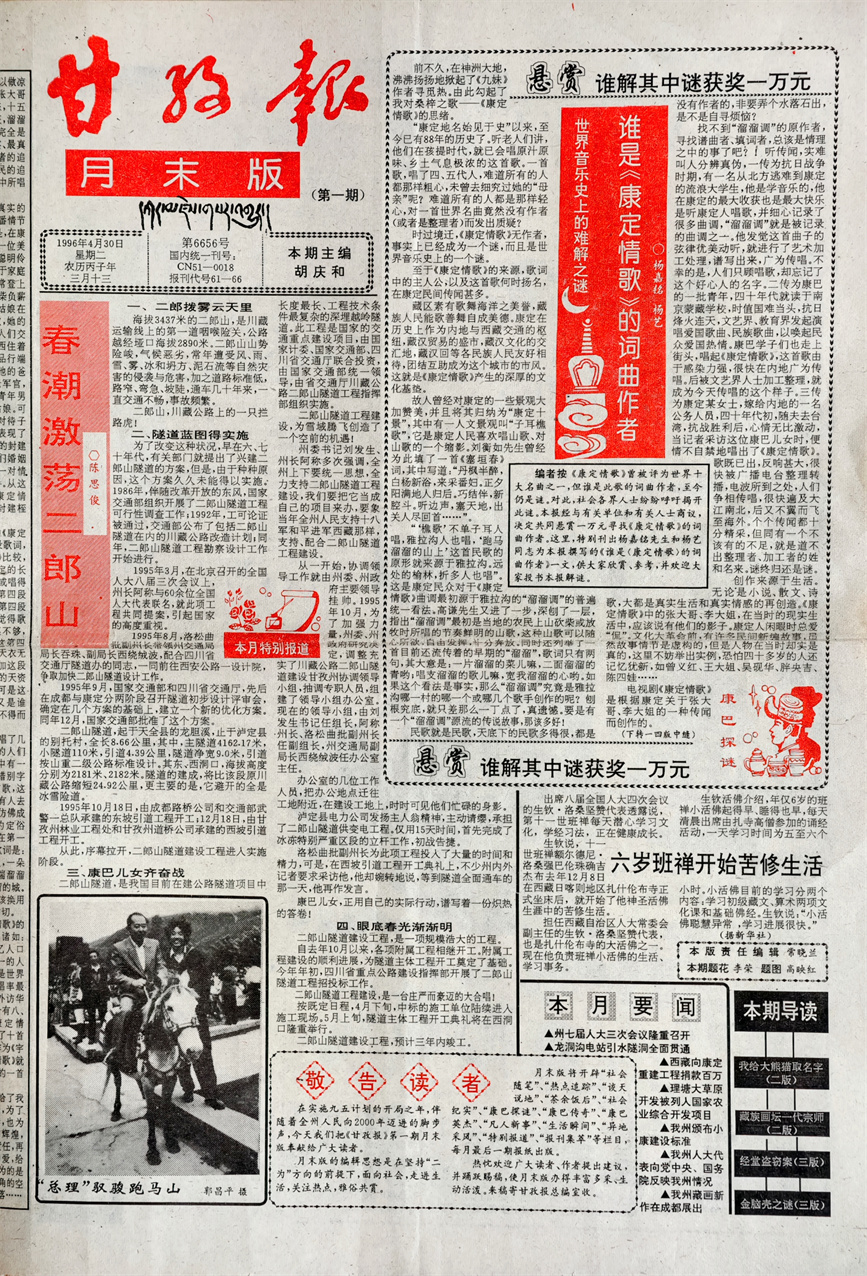第一期“月末版”第一版除了楊嘉銘先生和他女兒楊藝的這篇文章,同時還刊載了陳思俊先生采寫的有關(guān)二郎山隧道建設(shè)的文章《春潮激蕩二郎山》,第二版刊載了七美多吉先生寫的《我給大熊貓取名字》;扎西次仁先生寫的《藏族畫壇一代宗師——安多強巴》;楊仕強先生寫的《余德康和十里魚香》,以及我寫的《歡天喜地下農(nóng)村》。第三版刊載了陳貴林先生寫的《經(jīng)堂盜竊案》;陳艾老先生寫的《金腦殼之謎》以及紫夫先生寫的《看熱鬧也深沉》。第四版刊載了尹凌寫的《俄羅斯之冬》??纯催@些文章,光是標題就讓人有一種欲睹為快的沖動。所以這張報紙一經(jīng)問世,便在州內(nèi)外引起了廣泛的關(guān)注,州內(nèi)更是一時洛陽紙貴,大家紛紛到郵局搶購,辦公室內(nèi)一報難尋。尤其是“萬元懸賞尋找《康定情歌》作者”一事在康定城內(nèi)的街頭巷尾引發(fā)熱議,想不到享譽世界的《康定情歌》,居然作者是誰都還不明白。幾天之后,在全國享有極大影響力的《羊城晚報》、《華西都市報》、《四川日報》等知名媒體均在重要版面對此給予了轉(zhuǎn)載。