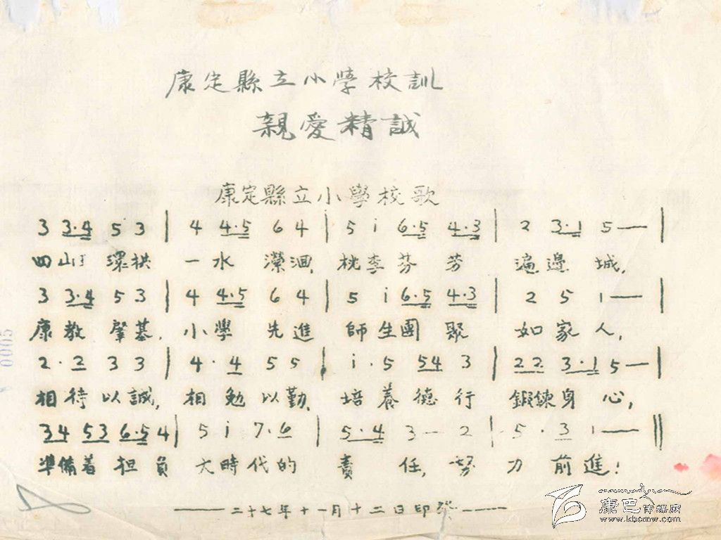 在眾多的民國教育檔案中,關(guān)于西康省各地學校的學生花名冊、學生成績表、學校經(jīng)費運用情況,以及教職工領(lǐng)取工薪的領(lǐng)條和表格等等有相當大的一部分。難得的是,在這些檔案中竟然出現(xiàn)了兩份“歌譜”。細看卻不只是“歌譜”,而是兩所小學把自己學校的“校訓”寫成的“校歌”。其中,一份是康定縣立小學依據(jù)校訓“親愛精誠”寫成的校歌,另一份是日地短期小學依據(jù)校訓“智仁勇”寫成的校歌。通過這兩份“校歌”,可以看到當時小學教育已經(jīng)較為正軌,還開設(shè)有音樂課。“校歌”的內(nèi)容積極向上,充盈現(xiàn)在所說的“正能量”,鼓勵學生努力學習,成為有擔當?shù)娜恕?/div>