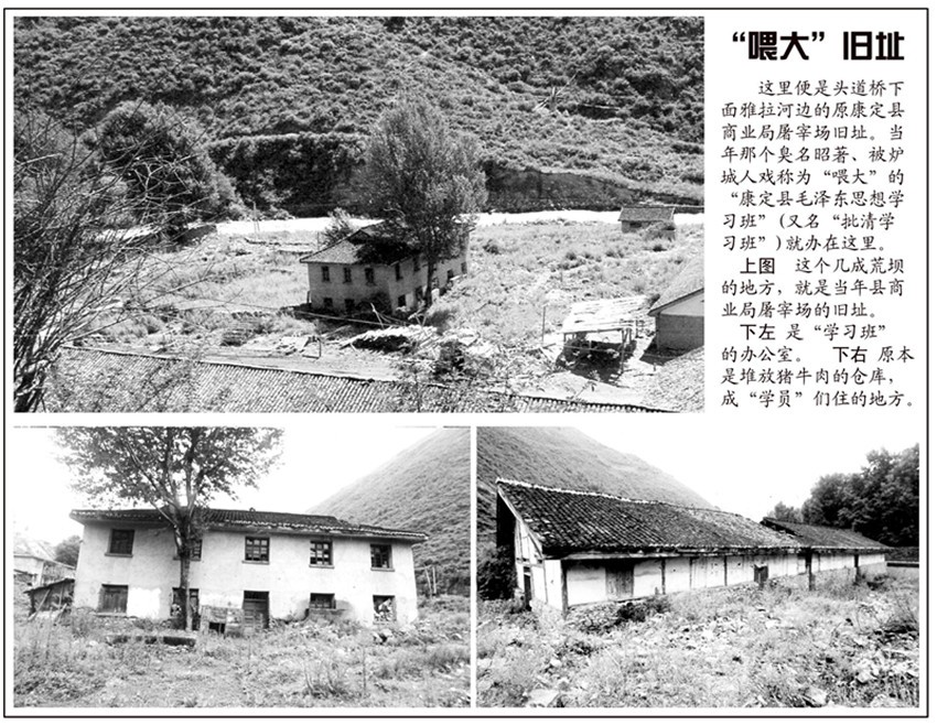 當(dāng)年康定縣搞“一批雙清”,特地選在雅拉河邊上康定縣商業(yè)局的屠宰場辦了個(gè)以“催肥”為目標(biāo)之一的“學(xué)習(xí)班”,其意就是要在這里將一些“不夠秤”的“5.16”“三老會(huì)”對(duì)象,“一批二斗”擠“材料”,像屠宰場催肥豬一樣“展”夠秤。所以爐城人將它戲稱為“喂大”。