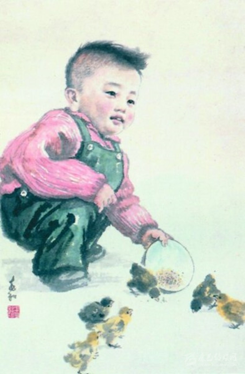 孩童飼雞圖。 蔣兆和/繪