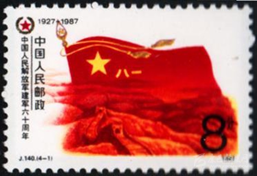1977年8月1日原郵電部發(fā)行的《中國人民解放軍建軍50周年》紀念郵票,其中第4枚“雄師過大江”,圖案中一名沖在渡江隊伍前面的戰(zhàn)士高舉一面“八一”軍旗。1987年8月1日原郵電部發(fā)行的《中國人民解放軍建軍60周年》紀念郵票一套4枚。其中第1枚“軍魂”,郵票上一面鮮紅的“八一”軍旗迎風飄揚,旗下是蜿蜒的萬里長城,代表了中國人民解放軍是保衛(wèi)祖國和人民的“鋼鐵長城”。1995年8月1日,原郵電部試發(fā)行一套“義務兵專用”郵票一套1枚,票名為“神圣的使命”,圖案以紅光四射的“八一”軍旗為背景,以現(xiàn)代化的飛機、坦克、火箭和象征和平的白鴿為襯托,畫面是威武的陸??杖?,顯示我軍鋼鐵長城般攻無不克、戰(zhàn)無不勝的精神風貌。