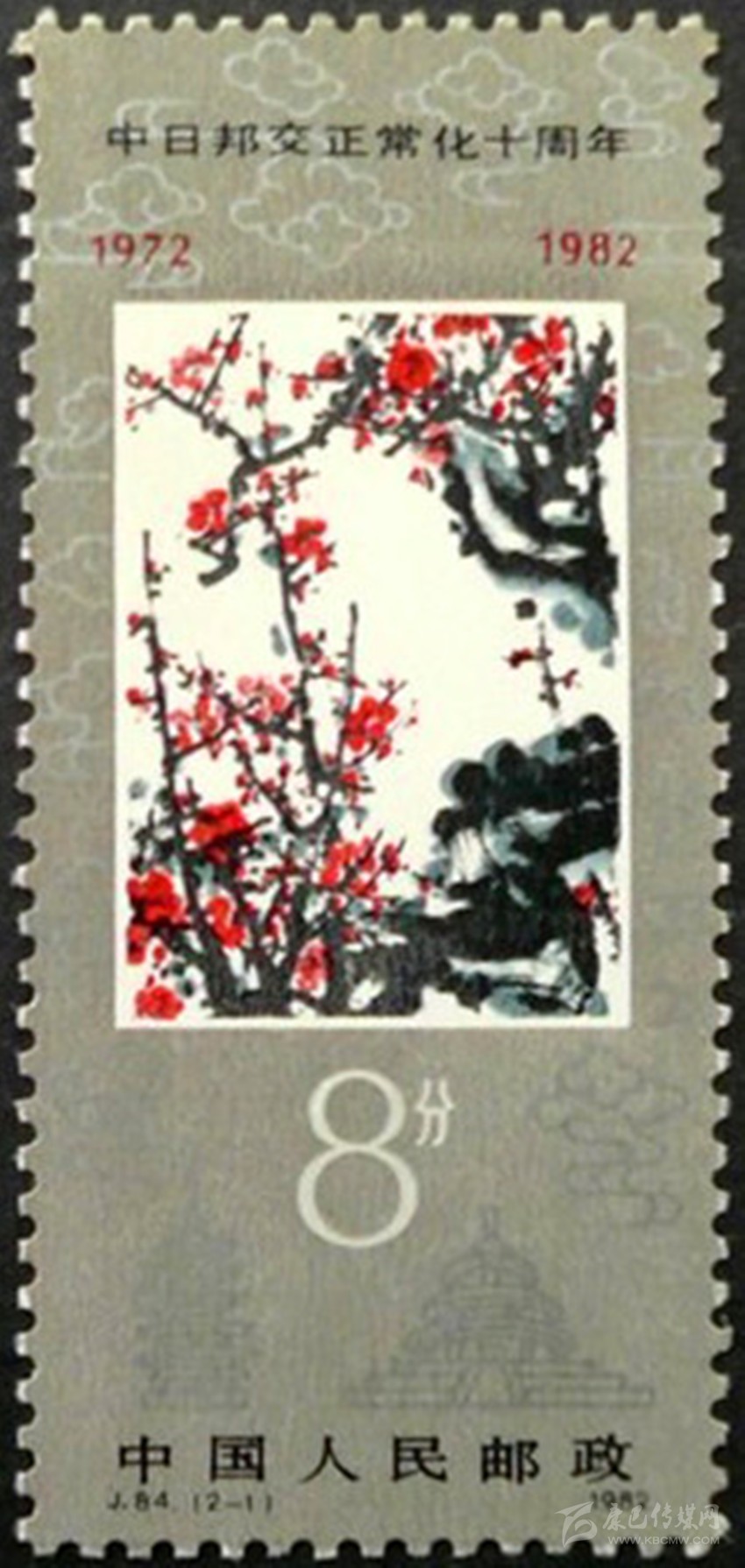1982年12月發(fā)行的《 中日邦交正?;苣辍芳o(jì)念郵票(2-1)“梅花”。