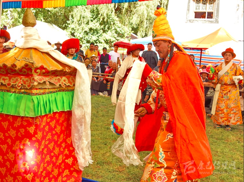 初次看到巴塘藏戲是康巴衛(wèi)視藏歷春晚,原以為是寺廟舞蹈,在唱聲杳杳里類(lèi)似川劇的喉腔讓我覺(jué)得新奇,于是找些資料看看了巴塘藏戲介紹。藏戲的開(kāi)山鼻祖唐東杰布。藏民歷來(lái)把他看作是創(chuàng)造藏戲的戲神和修建橋梁的鐵木工匠的“祖師”,是藏族人民心目中智慧、力量的化身。他將佛教經(jīng)典中的傳記同民間傳說(shuō)、神話故事等內(nèi)容融在一起,創(chuàng)作出一種具有人物性格和舞蹈、唱腔相結(jié)合的表演藝術(shù),使過(guò)去單一的跳神舞逐漸地戲劇化,表現(xiàn)手段也不斷加強(qiáng),并從宗教儀式中分離出來(lái),形成了藏劇藝術(shù)的雛形。
