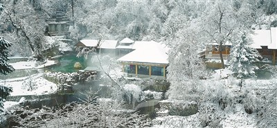 圖為游客在海螺溝冰川溫泉度假村拍攝藝術照。