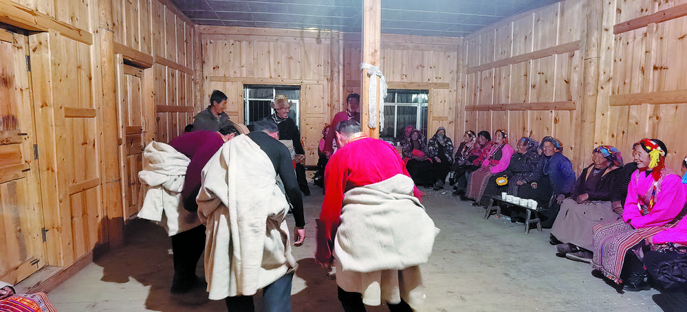 夜臨了,月低垂,整條山谷陷入了藍(lán)色的世界,近處是墨綠,遠(yuǎn)處是淡綠,雄渾的大山在綠的撫摸下也變得婀娜起來;古老寨子的火塘也燃起來了,勞作了一天的普米人聚在一起,跳起了原始氏族人群圍火而舞的傳統(tǒng)舞蹈,曲調(diào)悠揚(yáng)且古樸動(dòng)人。