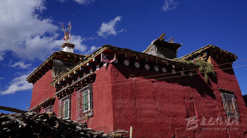 外裝飾也不繁復(fù)。外墻用磚紅色粘土調(diào)成泥漿上色,現(xiàn)在多用化學(xué)顏料。大門用一種叫“抓”的天然礦物質(zhì)涂料,這種顏料容易染色,挨一挨都會讓衣服沾上絳紅色,現(xiàn)在也用化學(xué)涂料代替。二樓與“砸口樓”檐口處裸露在外面的木頭,用漆絳紅色顏料涂抹,支出來的小圓木涂白色顏料。遠(yuǎn)遠(yuǎn)望去,紅白相間,錯落有致,巴塘方言藏語稱之為“東椎”。檐口頂上用排成“人”字形的小青瓦點(diǎn)綴,窗框和門框都涂成絳紅色,也用“東椎”與青瓦裝飾;有條件的人家安裝雕花窗棱,嫌麻煩就用普通的大格子窗。外置庭院,種花植木,一座傳統(tǒng)的紅藏房便竣工了。