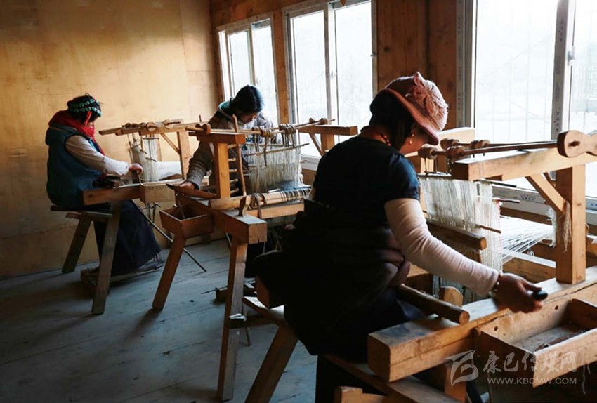 2003年,“編織班”邀請澤巴姆為老師,將這項技藝傳承了下來。現(xiàn)在,澤巴姆年紀大了,牛羊毛絨編織這樣繁復又耗體力的事情她不再做了,全交給了自己的媳婦扎西巴姆——當?shù)匚ㄒ坏呐Q蚪q編織老師。第二天,我們在編織班的工坊里見到了扎西巴姆。工坊一角的木架上擺著為數(shù)不多的圍巾、墊毯等產(chǎn)品,窗邊平行擺著六臺織機,扎西巴姆正帶著幾個藏族婦女坐在其間飛梭走線。陽光從窗戶透進來,投射在織機和織女們身上,古老的場景、緩慢的節(jié)奏恍惚把我?guī)Щ亓俗婺傅臅r代。扎西巴姆說,當?shù)厝朔Q牦牛絨為