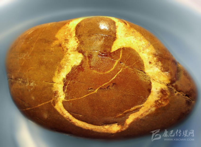 作為一個(gè)無(wú)組織的業(yè)余獨(dú)行淘石者,經(jīng)過(guò)數(shù)年的摸、淘、琢磨,我悟出:發(fā)掘趣石最重要的是要獨(dú)具慧眼慧心,會(huì)讀石紋。是否讀懂石紋,決定著一塊石頭是頑石還是奇石的命運(yùn)。這是一件很難的事,不僅要運(yùn)用你獨(dú)特的審美視角,還得發(fā)揮你豐富的想象。有時(shí),為了讀懂一些石紋,我會(huì)抱著這塊石頭如考古學(xué)家般仔細(xì)琢磨,從正面、側(cè)面,再到背面,又從左邊旋到右邊,或者上下顛倒來(lái)打量……一番冥思苦想,會(huì)意會(huì)神,直到靈感涌起、慧心頓悟,尤如洞天石扉訇然中開(kāi),眼前的頑石拙巖,頃刻便化為藝術(shù)珍寶,令我欣喜若狂。正如悉達(dá)多說(shuō):“這塊石頭是石頭,它也是動(dòng)物,也是神,也是佛,我敬重它和熱愛(ài)它,并非因?yàn)樗谐蝗諘?huì)變成這個(gè)或那個(gè),而是因?yàn)樗缇褪沁@一切,一直是這一切?!背錆M(mǎn)靈性的石頭在你和美妙的自然間搭起了一座通靈的橋梁。淘得趣石,還需緣分。就像人與人的相遇講究緣分,遇到心儀的石頭也講究緣分天助。有年春節(jié),我與父親去河邊轉(zhuǎn)游,面對(duì)涪江寬闊的石灘,我的淘石癮又犯了。但出門(mén)前答應(yīng)過(guò)父親,這次只逛不撿石頭。我知道老爸心疼我一個(gè)女子大過(guò)年的撿石頭。河邊冷,且石頭扛起來(lái)很重,手與衣服都會(huì)弄得很臟。我邊陪父親漫走閑聊,眼睛卻止不住往河灘逡巡,仍希望無(wú)意中淘到中意的石頭。走著走著,我發(fā)現(xiàn)有一群鳥(niǎo)歡唱著從遠(yuǎn)處一個(gè)石堆飛起,冥冥中感覺(jué)那里有寶貝,遂向老爸懇求,過(guò)去看一下就回來(lái)。來(lái)到那個(gè)石堆中心,幾乎不費(fèi)什么功夫,就看到一塊橢圓形石頭上有著一個(gè)自帶金色佛光圈的如來(lái)佛半身像。我怔住了,有點(diǎn)不敢相信如此幸運(yùn),蹲在那里久久打量。老爸隨后趕過(guò)來(lái),看到佛像石,連連贊嘆了好幾句“太神奇了”。然后,他毫不猶豫地就幫我把石頭搬起來(lái)就走。回到家中,如獲至寶的我,趕緊清洗石頭,在清水的滋潤(rùn)下,佛像的輪廓更加清晰。頸上的佛珠、袈裟線(xiàn)也分明,細(xì)看令人叫絕的這竟是一尊三面佛:正面、左側(cè)向、右側(cè)向均是佛。而在此石背面,也清晰出現(xiàn)了一個(gè)草書(shū)的“吉”字,真令人喜出望外。吉佛石,就這樣神奇地走進(jìn)了我的生活,讓我相信一切緣分都是可遇不可求的。