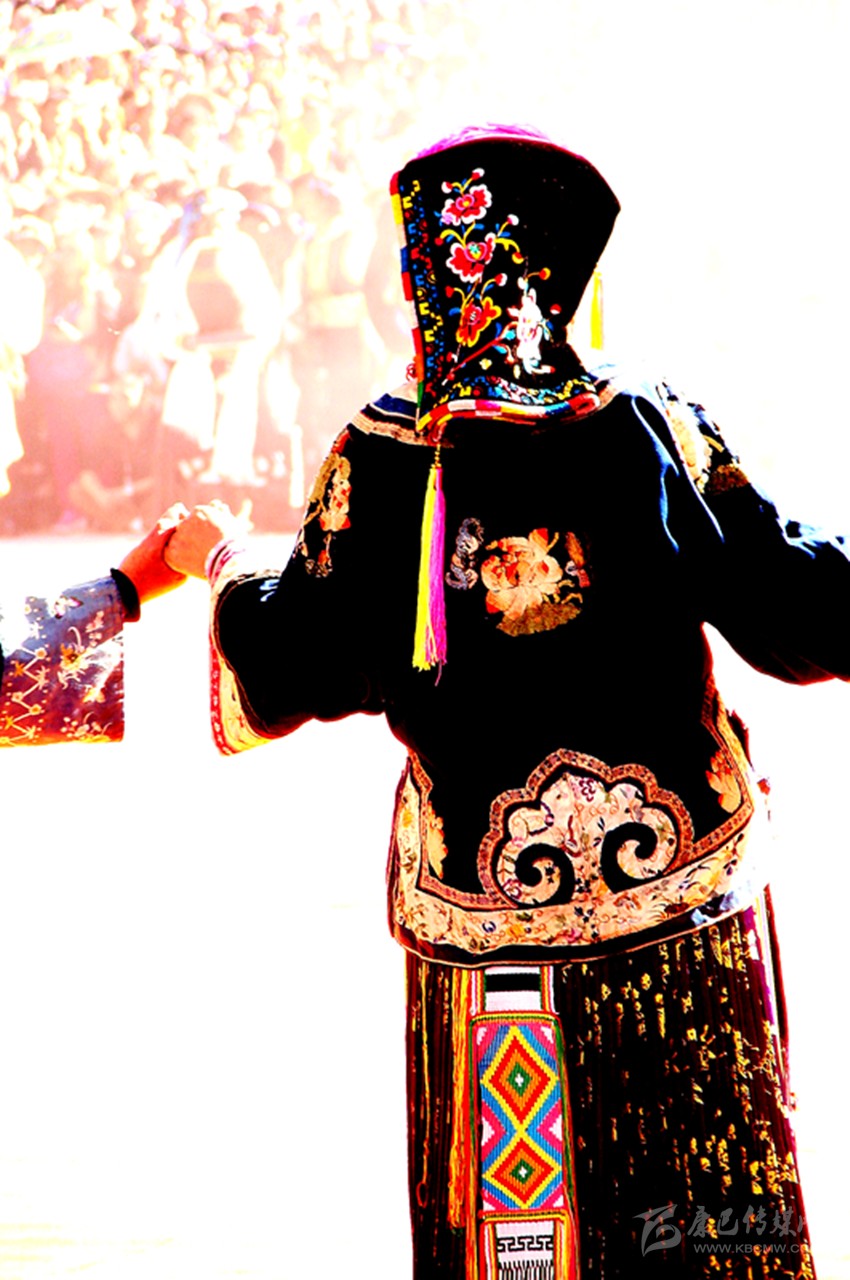 縱觀宅龍服飾,我們不禁產(chǎn)生這樣的疑問。在清朝時(shí)期,社會(huì)等級森嚴(yán),服飾之上的圖案最能代表主人身份的高低,因此決不能濫用。而這里的女性服飾上卻繡有龍虎、麒麟等官員服飾才有的圖案,確實(shí)讓人奇怪。不過,對于這種服飾的由來,從當(dāng)?shù)匚幕耸靠谥幸驳弥艘恍┬畔?。一是在解放前,由于守備、千總與大金川土司、沃日土司等有過聯(lián)姻。土司女兒入嫁這里時(shí),曾帶來陪奩數(shù)十箱。除了金銀首飾外,大多數(shù)都是入嫁女的服飾,其中就不乏這種服飾。后來,這些服飾或賞賜給屬民,或遺失后散落到民間,才使得這些服飾走進(jìn)了尋常百姓家,成為傳家寶。二是在清朝時(shí)期,內(nèi)地的一些商家趕著馱運(yùn)貨物的馬匹翻越巴朗山,將這些貨物運(yùn)送到懋功縣(今小金縣),用物物交換的方式換取當(dāng)?shù)氐拿F中藥材,其中就不乏這種絲織品服飾。那時(shí)候,宅龍村寨離懋功縣只有四十余里的路程,因此,這些絲織品也就走進(jìn)了百姓家里。一直珍藏到現(xiàn)在,才有了享譽(yù)整個(gè)嘉絨地區(qū)最美服飾的榮譽(yù)。